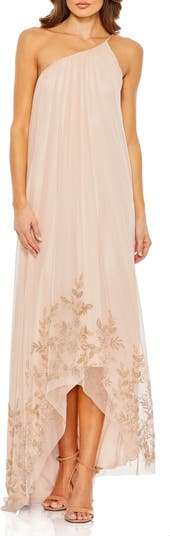 This flowy one-shoulder gown features an asymmetrical design and delicate beading for an elegant touch.