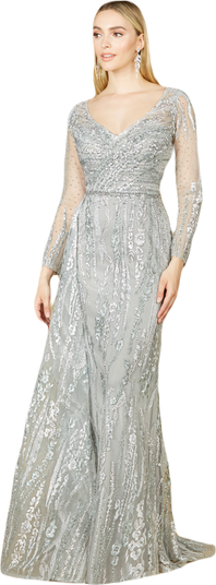 Full length lace dress with long sleeves, v neck dress embellished with rhinestones, lace appliques. It features a skirt overlay.