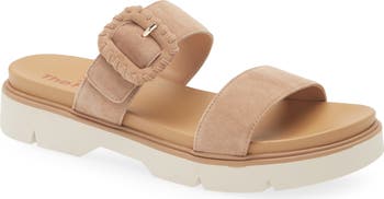 A whipstitched buckle adds to the charm of this strappy slide sandal perched on a flexible footbed built for grab-and-go elegance.