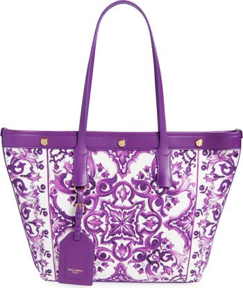 A purple print inspired by hand-painted majolica tiles emboldens this spacious tote crafted of cotton canvas and trimmed with smooth leather.