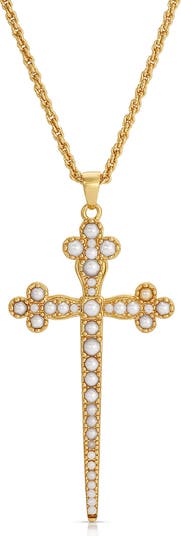 Imitation pearls bring soft luster to the vintage-inspired cross pendant at the center of this golden necklace.