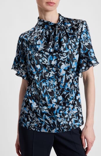 This short sleeve blouse is crafted from floral matte charmeuse, offering a soft sheen and fluid drape that feels effortlessly elegant. The high neckline with an asymmetric tie adds a modern, feminine twist, while subtle ruffle panels at the sleeves bring gentle movement. Designed in a relaxed pull-over silhouette, it balances polish with everyday ease. Style it with tailored trousers or a sleek skirt and heels for a refined look that transitions seamlessly from work to evening.