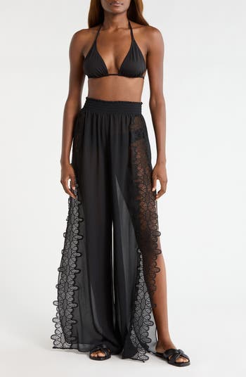 A semisheer silhouette defines these high-waist cover-up pants punctuated with intricate lace appliqués and side-split wide hems, creating the perfect look to take you from the cabana to dinner.