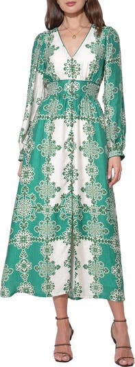 Lightweight, softly crinkled fabric defines a gorgeous maxi dress with long sleeves and small buttons at the front.