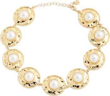 Lustrous faux pearls glow in molten settings all around this statement-making necklace plated in 14-karat gold.