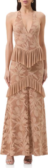 Floral lace and flouncy ruffles romance this figure-skimming maxi made with a low-dipping neckline and meant to show off your shoulders and back.