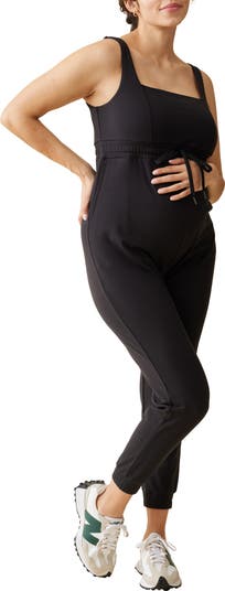 Accommodate your growing bump with ease in this activity-ready maternity jumpsuit made with a drawstring waist and tapered jogger-inspired legs.