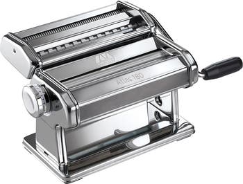 The Marcato Original World-Famous Atlas 180 Pasta Machine, called the Ferrari of the pasta machine world by Cook's Illustrated, rolls and cuts pasta dough for making traditional Italian pasta at home. Nothing tastes better than fresh authentic homemade pasta and learning how to make fresh pasta couldn't be easier! Easily make 3 pasta shapes, lasagna, fettuccine, and tagliolini. The adjustment dial easily controls the dough thickness and rolls homemade pasta dough evenly for a consistent texture, cook time and taste. Rolled pasta cooks more evenly and absorbs more delicious sauce. Roll dough up to 180-millimeters wide and quickly choose from 10 different thickness settings, between a paper-thin 0.6-millimeters to 4.8-millimeters, to personalize pasta on the fly to each recipe. The Atlas 180 Pasta Machine is equipped to attach a Pasta Drive motor, which is sold separately. No other attachments are available for this model. Made in Italy from chrome-plated steel. Wipes clean with a dry brush or cloth after each use. Includes the Pasta Machine, pasta cutter, hand crank, clamp, complete instructions and a 10-year manufacturer's warranty.