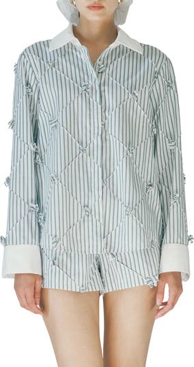 Delicate floral appliqués and diamond seaming rework the classic pinstripe on this cotton-enriched button-up top finished with a contrast collar and exaggerated cuffs for contemporary polish.