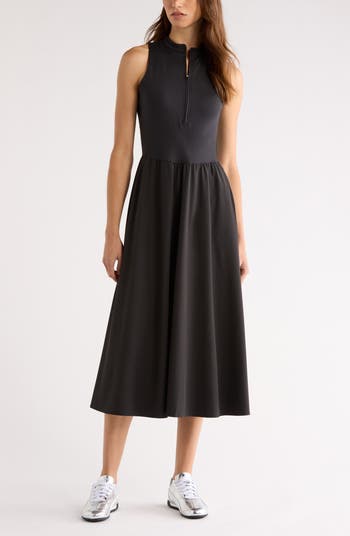 Take a stroll through the market before meeting friends for lunch in a sleeveless midi designed with a half-zip placket, stand collar and twirly skirt. The casual-cool style is perfected with a stretchy knit and convenient pockets at the sides.