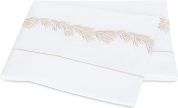 An embroidered coral pattern flows gracefully over this crisp cotton-percale flat sheet framed by a small satin-stitch border.