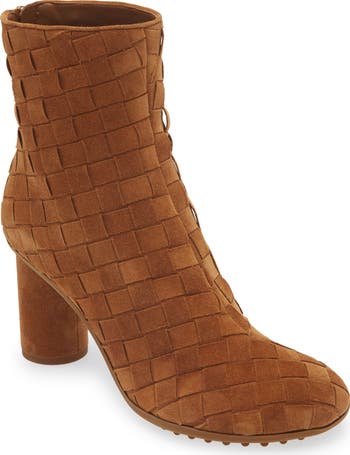 The Milanese label's signature intrecciato weave highlights the artisanal craftsmanship of this rich suede bootie lifted by a chunky cylindrical heel.