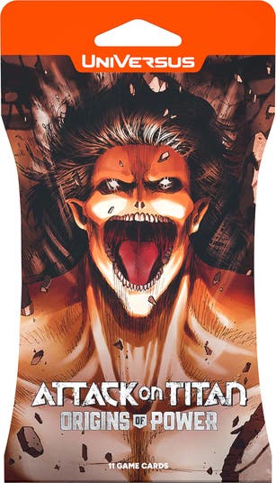 UNIVERSUS ATTACK ON TITAN: ORIGINS OF POWER - BOOSTER - Expand your Attack on Titan collection with the Origins of Power booster set! The second Attack on Titan booster set features more of your favorite characters and iconic moments from the manga, all brought to life with stunning artwork. Don't miss out on this highly anticipated addition to UniVersus. One hundred years ago, humanity faced extinction when the monstrous Titans invaded and devoured almost all humans. The survivors hid behind massive walls to protect themselves. The Titans are a distant memory, and a boy named Eren dreams of exploring the world outside Wall Maria. But his dream will become a nightmare when the Titans return and humanity is again on the edge of destruction. CONTAINS: 1 Booster Packs. Each Pack contains 11 randomly assorted cards. Attack On Titan: Battle For Humanity Universus CCG - bringing the manga masterpiece by Hajime Isayama to life. A welcoming experience for UniVersus CCG newcomers while still offering a strategic depth for experienced players, allowing all experience levels the ability to enjoy the thrill and fun of the game.