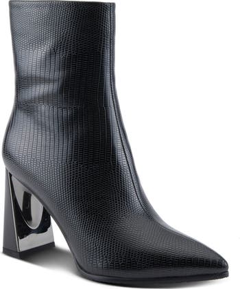 Snakeskin embossing textures a pointy-toe bootie that lifts you on a shaved block heel.
