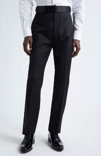 A sleek satin waistband and side stripes contrast with the rich wool-and-mohair body of these tuxedo-styled trousers masterfully crafted in Italy.
