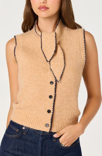 A scarf detail adds extra style points to a trend-right sweater vest traced in contrast stitchwork.