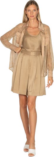 Secret Mission’s Aubree Top is crafted from 100% silk with lace, designed in a Caramel hue. This romantic yet modern blouse features a button-down front, pointed collar, and sheer lace body contrasted with silk patch pockets and trims. The top comes with a matching separate camisole for layering or can be styled with our Lara Tank and Claudette Shorts. This piece captures an effortlessly elegant balance between structure and softness.
