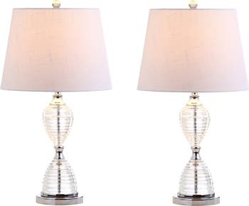 The unique texture and hourglass shape of this crystal table lamp give a classic category a modern update. Up top, a white linen tapered drum shade softens the glow from the bulb and is held in place by a crystal finial to complete the look. An elegant and chic accent for any empty tabletop!