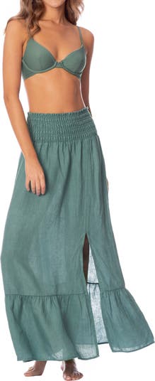 This smocked cover-up skirt is made from breathable linen and is designed to be styled multiple ways.
