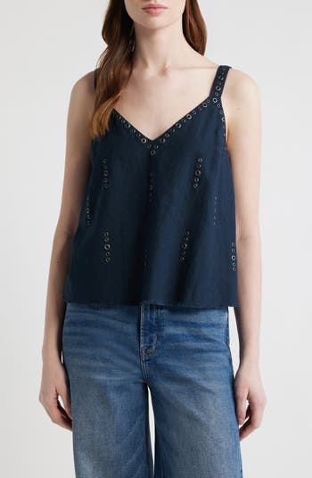 Grommet trim adds an edgy feel to this drapey V-neck camisole made from a lightweight linen blend and topped with adjustable straps.