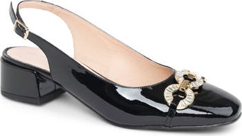 Crystal-embellished hardware highlights the square toe of a glossy patent-leather pump that provides a graceful finish for any look.