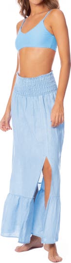 This smocked cover-up skirt in breathable linen is designed to be worn as a strapless dress or a maxi skirt.