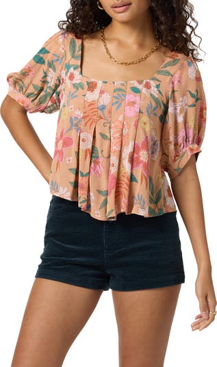 Crinkly and lightweight, this pleated shirt toes the line between casual and fanciful with its puff sleeves and beautiful blooms.