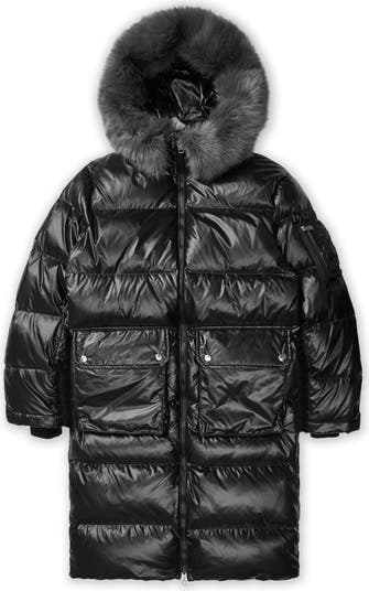 A long over-the-knee sophisticated puffer with military two-way patch pockets. Highlighted with glossy silver hardware and a luxurious detachable fur hood brim, transforming it into a luxury coat when desired. The detachable fur brim can also be used as a scarf individually, with a snap closure at the inner corner.