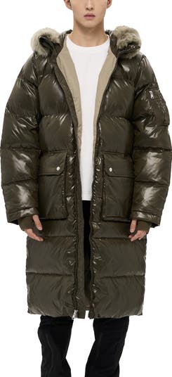 - A long over-the-knee sophisticated puffer with military two-way patch pockets. Highlighted with glossy silver hardware and a luxurious detachable fur hood brim, transforming it into a luxury coat when desired. The detachable fur brim can also be used as a scarf individually, with a snap closure at the inner corner.