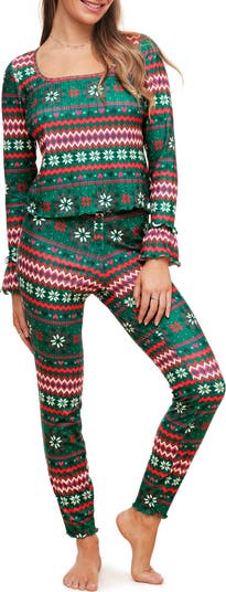 Stay warm this winter with this cozy, knit PJ set. The set includes a long sleeve top with lettuce edge hems and leggings with an elastic waistband, faux placket, and snaps.