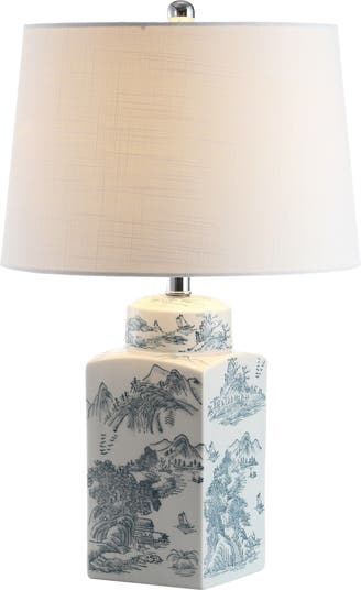 Inspired by antique Chinese pottery depicting mountain and forest scenes, this traditional ginger jar lamp is made modern by the new square shape which replaces a classic urn silhouette. Made from ceramic and with a hand-applied glaze pattern, the look is completed with a white cotton shade and chrome accents. Sure to be an heirloom of tomorrow, this lamp still features compatibilities with the luxuries of today, including a silk-wrapped UL-certified cord and LED bulb compatibility.