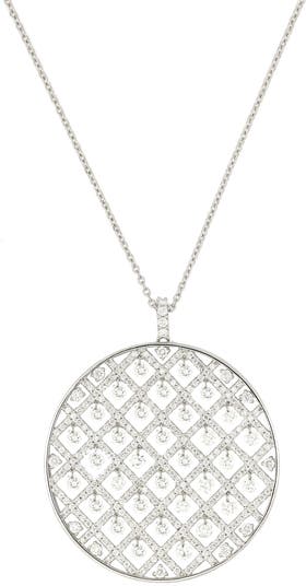 A round lattice pendant houses dangling and still diamonds on this handcrafted 18-karat gold necklace that will send light dancing with every twist.