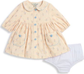Outfit your babe in this sweet set featuring a flowery cord dress with a charming Peter-Pan collar and accompanying bloomers.