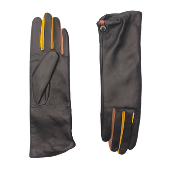 Audrey is a mid-length glove in lambskin lined with alpaca. Soft and warm they feature contrasting leather in autumn tones between the fingers for a subtle pop.