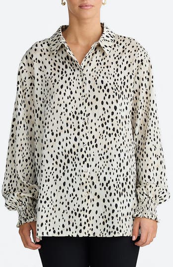 An eye-catching ocelot pattern animates a silky-smooth button-up shirt styled with smocked cuffs to balance the oversized silhouette.