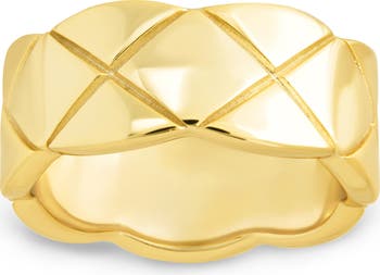 Quilt-inspired engraving brings dimension to a band ring crafted from sterling silver.