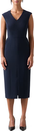 Easy to style up or down, this tailored sheath is shaped with seaming and offered in a classic shade of navy blue.
