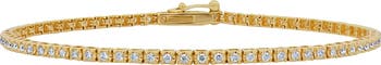 A grand total of 72 round diamonds lines a timeless tennis bracelet handcrafted in warm 18-karat gold.