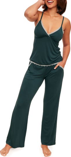 This sleepwear set is perfectly cozy and features a body-skimming fit and adjustable straps. The lace trim adds a touch of romance, and the flared pants have side pockets and an elastic waistband for comfort.