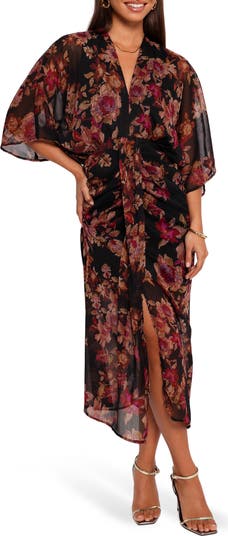 A gracefully gathered silhouette adds a romantic touch to this drapey chiffon midi dress covered in a moody floral print.