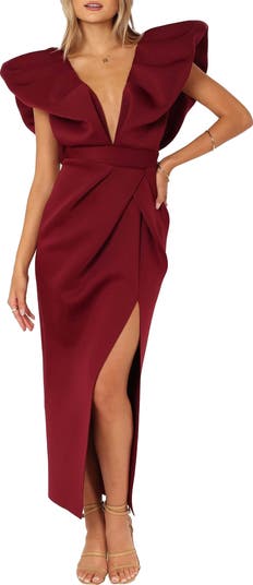 Dramatic puffed frills at the shoulders balances the deeply dipped neckline of this party-ready frock finished with a leggy slit at the hem.