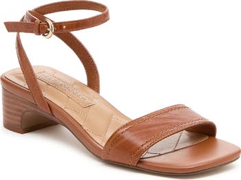 A delicate crossover ankle strap and low stacked heel lend secure confidence to a chic sandal crafted from vegetable-tanned leather with a quilted, cushioned footbed.
