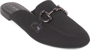 Glinting horsebit hardware highlights the breathable knit upper on a loafer-inspired mule grounded by a cushioned footbed and flexible sole.