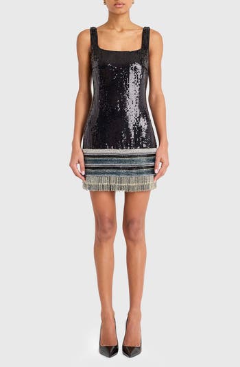 Glittering sequins and movement-making beaded fringe highlight the modern-flapper inspiration of this shift minidress perfect for a night of dancing.