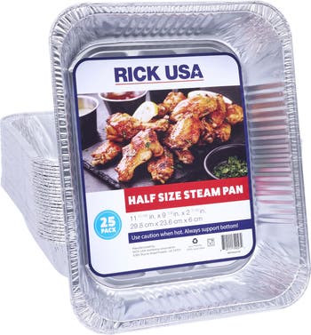 RICK-USA EXTRA HEAVY-DUTY HALF SIZE ALUMINUM FOIL PANS (25-PACK) - 11.69" x 9.25" x 2.44" Crafted from durable, high-grade aluminum with reinforced walls, these pans deliver exceptional sturdiness. Precise embossing that enhances structural integrity. Adding more side wall grooves for increased stability. Designed for superior heat conductivity, they ensure even baking, roasting, and reheating every time. Oven and Dishwasher Safe: Designed for hassle-free use, these aluminum pans are oven-safe and dishwasher-safe, allowing for easy preparation and cleanup. Convenient Disposable Design: No need to worry about cleanup - simply toss these pans in the recycling bin after use, making them ideal for parties, camping, picnics, and meal prepping. OVERVIEW: Aluminum foil pans. Recyclable. Disposable. Cooking. Baking. Leftovers. Heating Food. Ultra Strong, Heavy Duty Disposable Foil Pans For Baking, BBQ, Roasting & Left Overs. Deep Tin Foil Bakeware, Steam Table Tray, Cookware, Food Prepping, Cake & Oven Pan Outstanding Quality. SAFE FOR: oven, freezer, cooktop, dishwasher, grill.