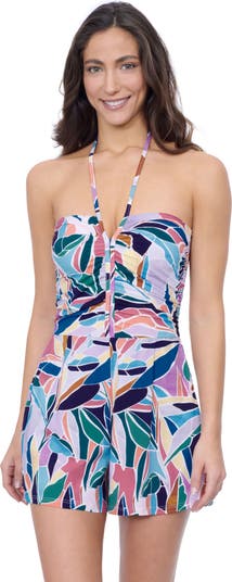 The Aura Bandeau Romper Swim One Piece offers a chic and flattering fit with soft cups for support and tummy control for a smooth silhouette. Adjustable, removable straps provide styling options, making this swimdress a versatile addition to your swimwear collection.