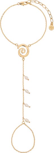 Lustrous freshwater pearls dangle from your finger to your wrist in this delicate hand chain punctuated with a molten swirl charm.