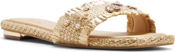 This fun warm-weather slide sandal features Pillow Walk dual-density foam in the padded footbed for comfort and an embellished toe strap edged in fringe.