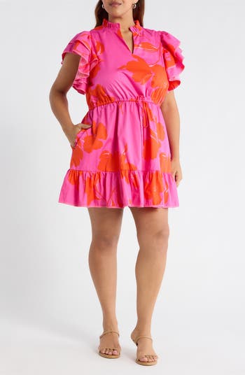 Floral and flirty with a romantic twist, this ruffle-trimmed shift mini brings easy charm to any day. Dramatic ruffles frame the short sleeves and a split neckline topped with a ruffled mock collar, while a drawstring waist lets you cinch the fit just how you like it.