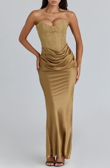 Be the source of romance in the room in a strapless gown that starts with a fitted corset and finished with a glossy, gracefully draped satin skirt.